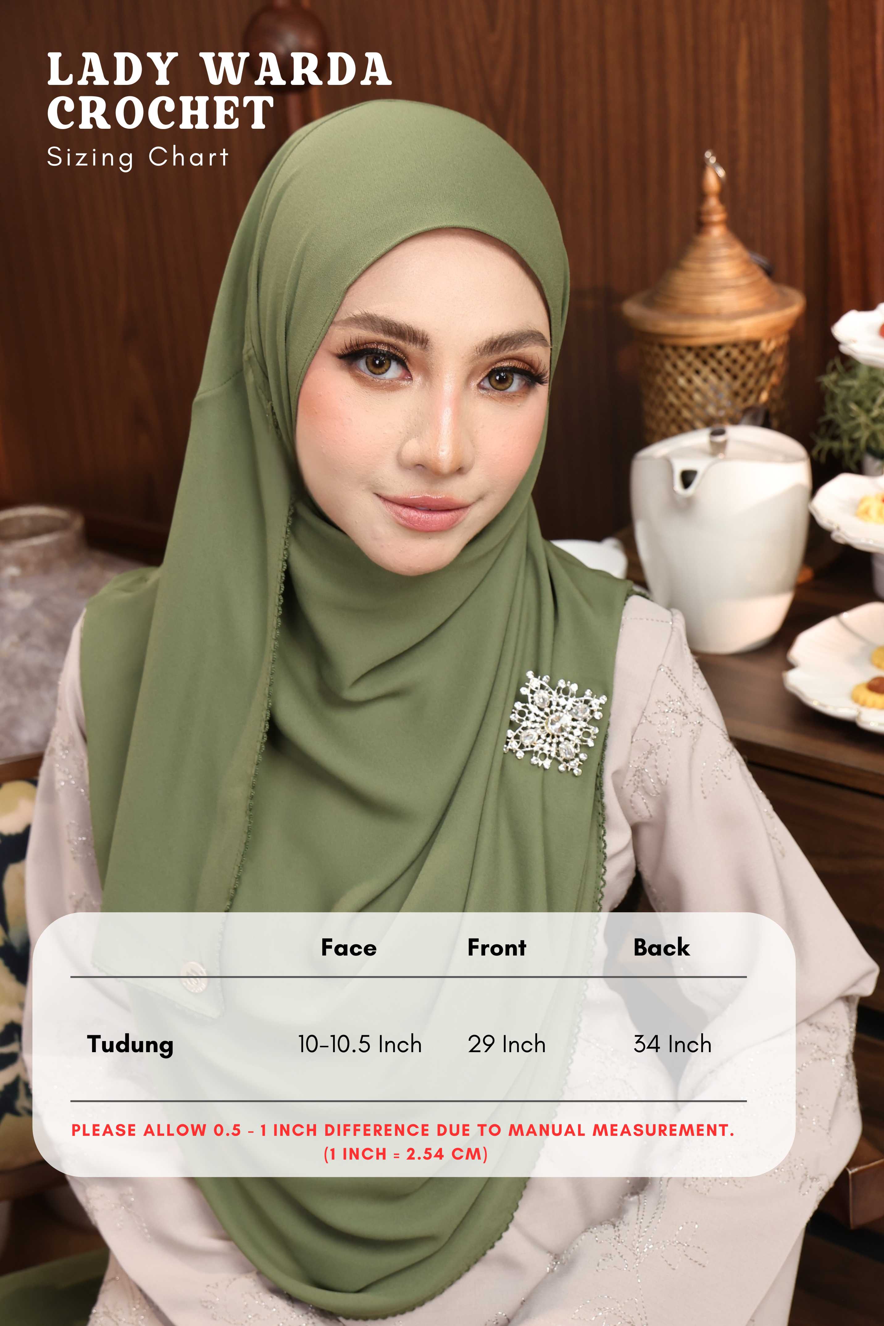 • Tudung: Face Opening: 10 - 10.5 Inch,  Front Length: 29 Inch, Back Length: 34 Inch